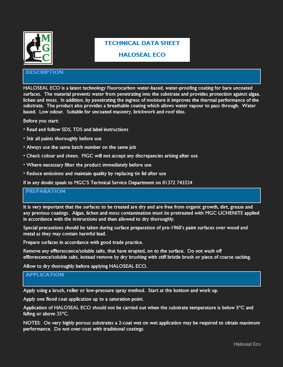 HALOSEAL is a non-silicone waterproofer, based on metabolic stearates and, unlike traditional waterproofers, penetrates deep into the fabric and becomes an integral part of the substrate. As a result of the depth of penetration, HALOSEAL has a reciprocal effect, reducing the ’u’ value of the wall. HALOSEAL is, therefore, extremely beneficial in keeping the wall and substrate dry, which helps to reduce excessive heat loss that occurs through damp walls.