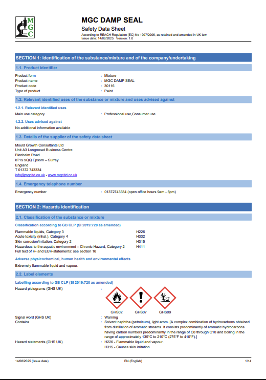 MGC One Coat Damp Seal is a high-performance interior paint which permanently covers damp, water stains and most household stains. It dries with a long-lasting permanent seal over damp walls and ceilings and can be over coated with emulsion or gloss paint as well as wallpaper. It is specifically formulated to allow trapped moisture to escape over time so preventing flaking paint or peeling wallpaper.